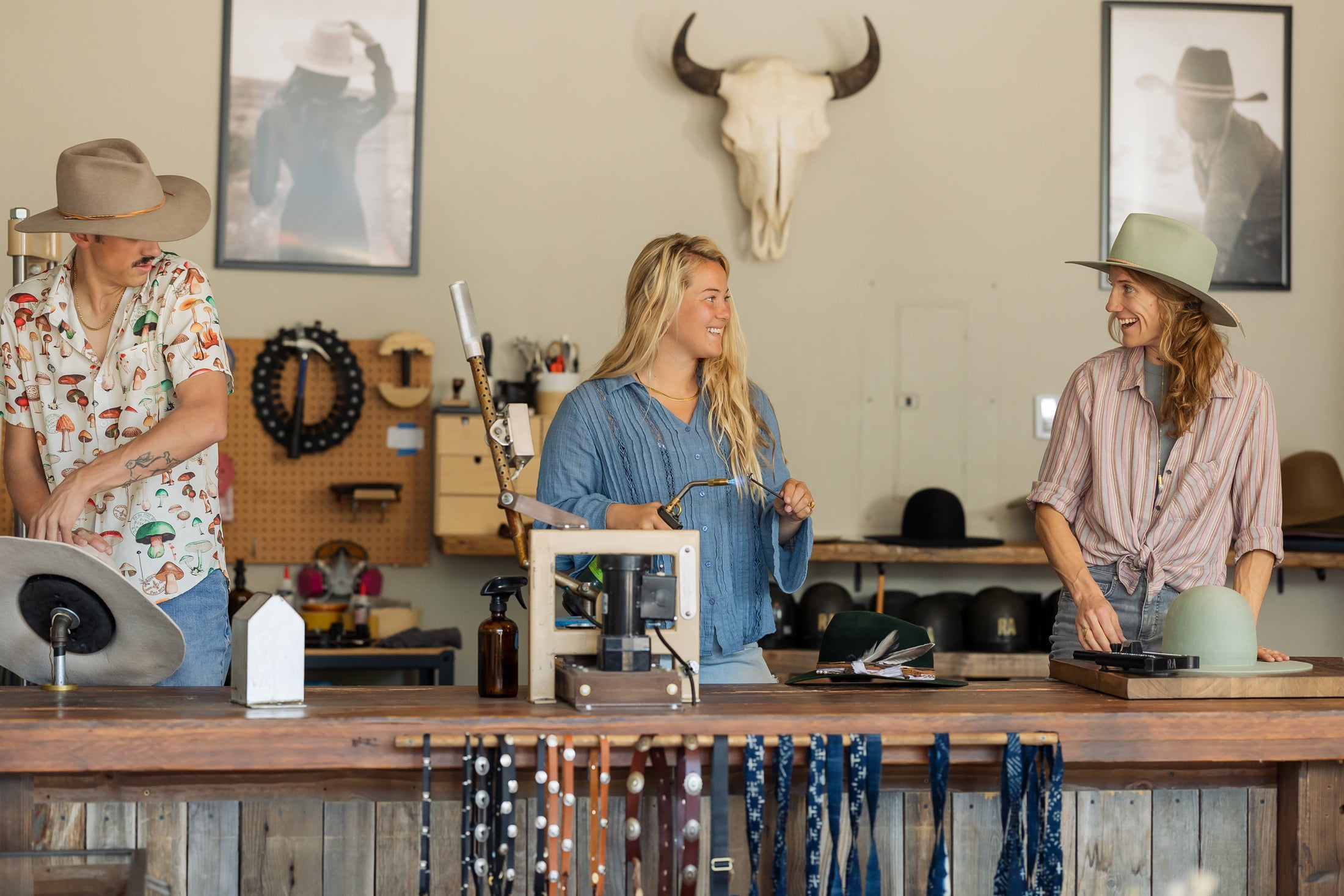 Bring something unforgettable to your celebration. The Björkstam Hat Bar is a fully curated, hands-on hat-making experience where guests design the finishing touches on their own custom western hats. We help you choose the right package for your event that includes materials, trims, shaping, and finishes — all guided by a team of professional hatters.