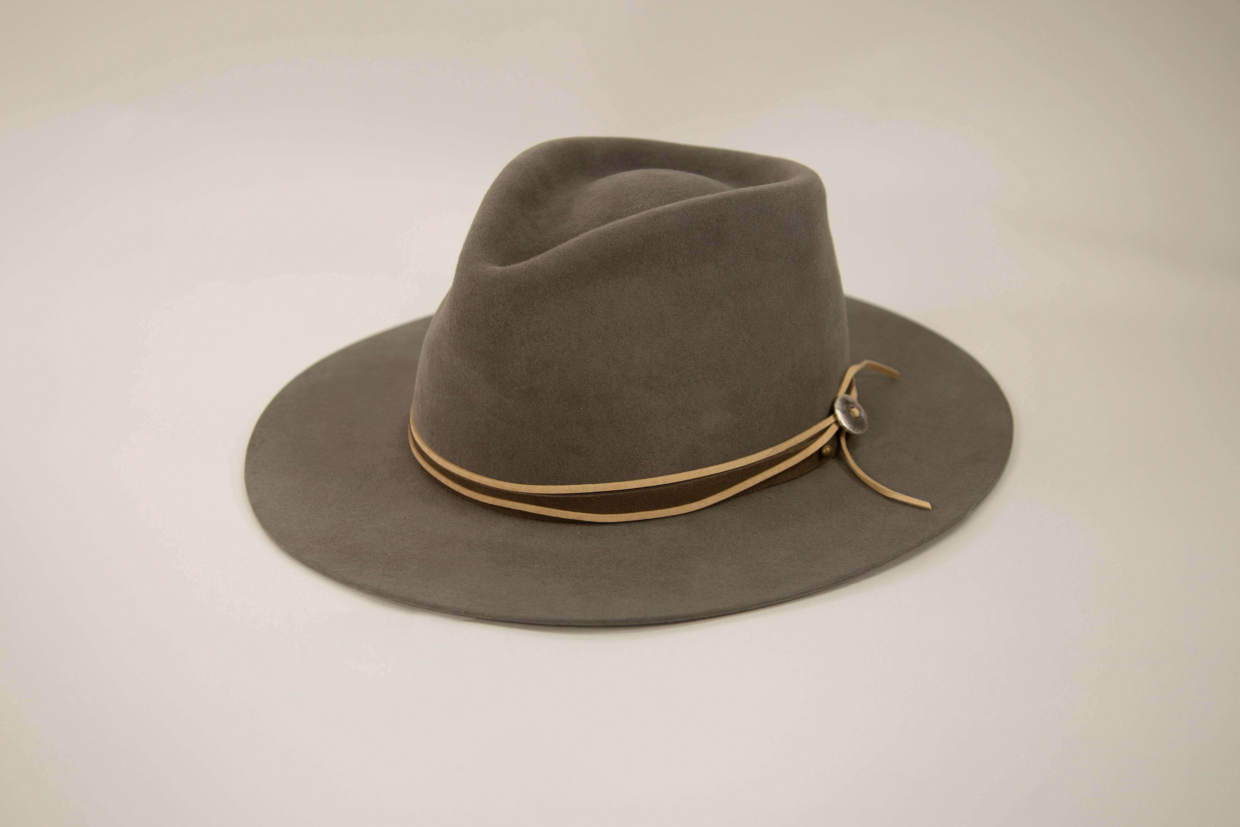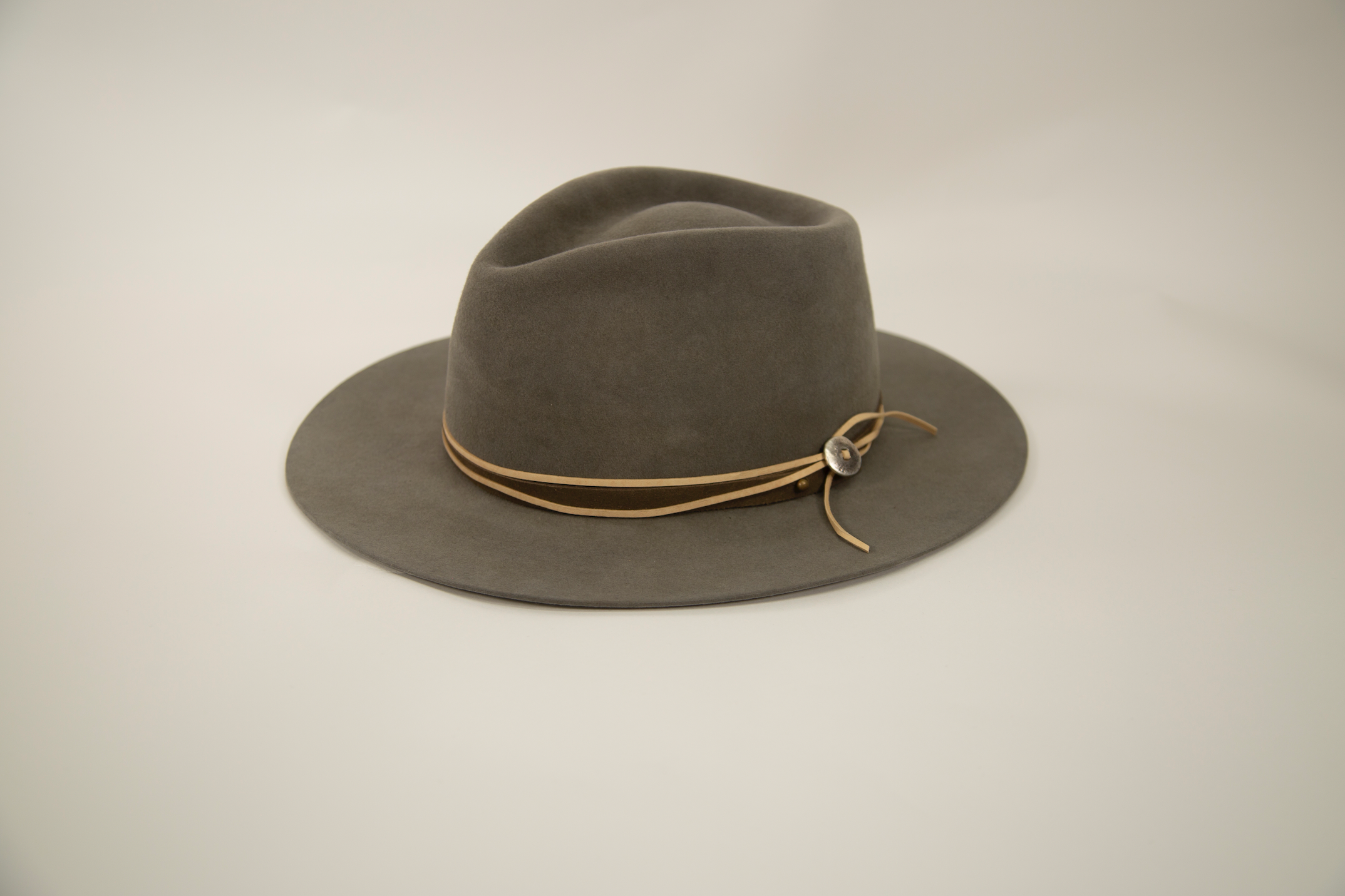 - Hat Band: A combination of dark suede leather band accented by a wrap of cream colored deerskin leather. All tied together with a hammer finished metal pendant.