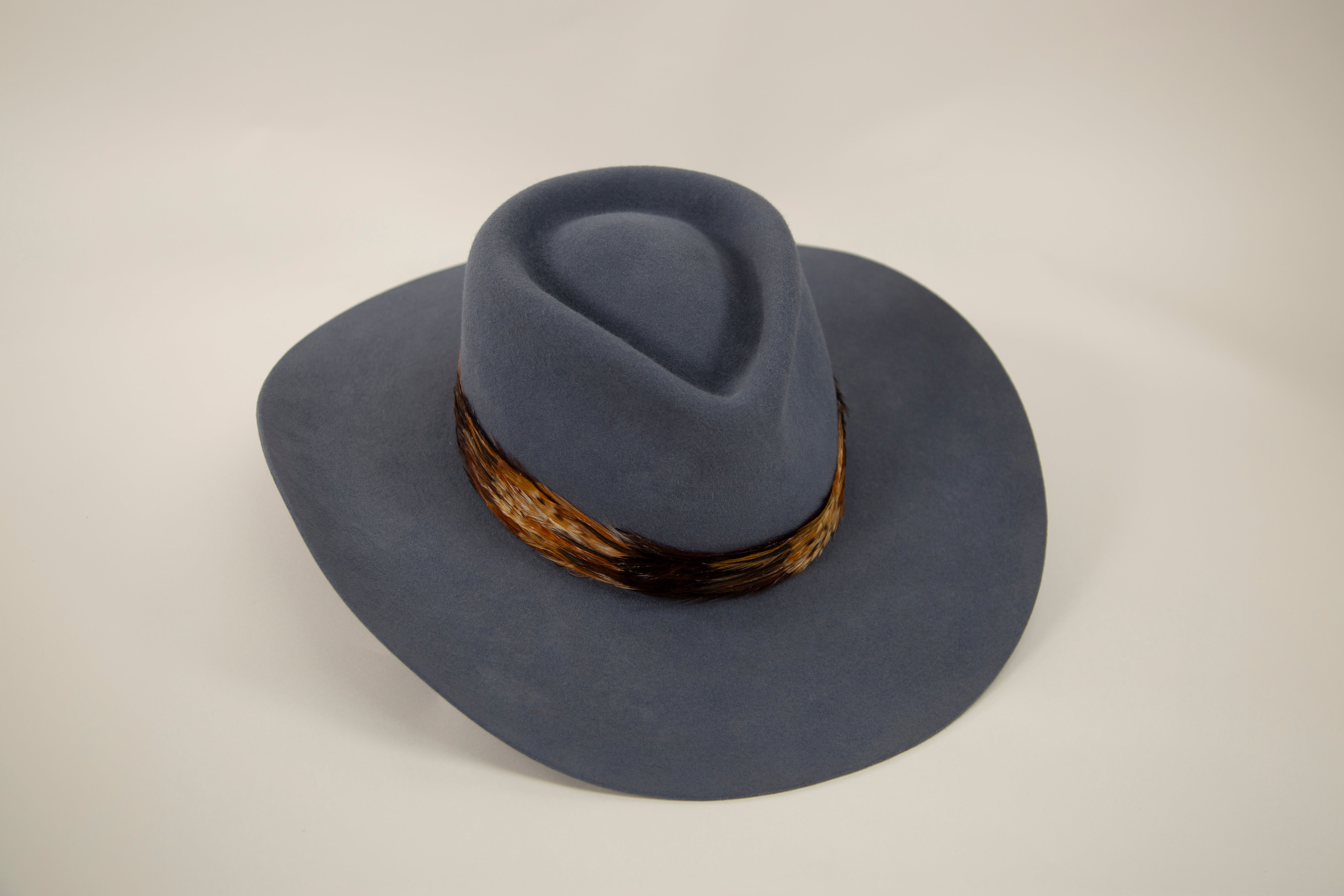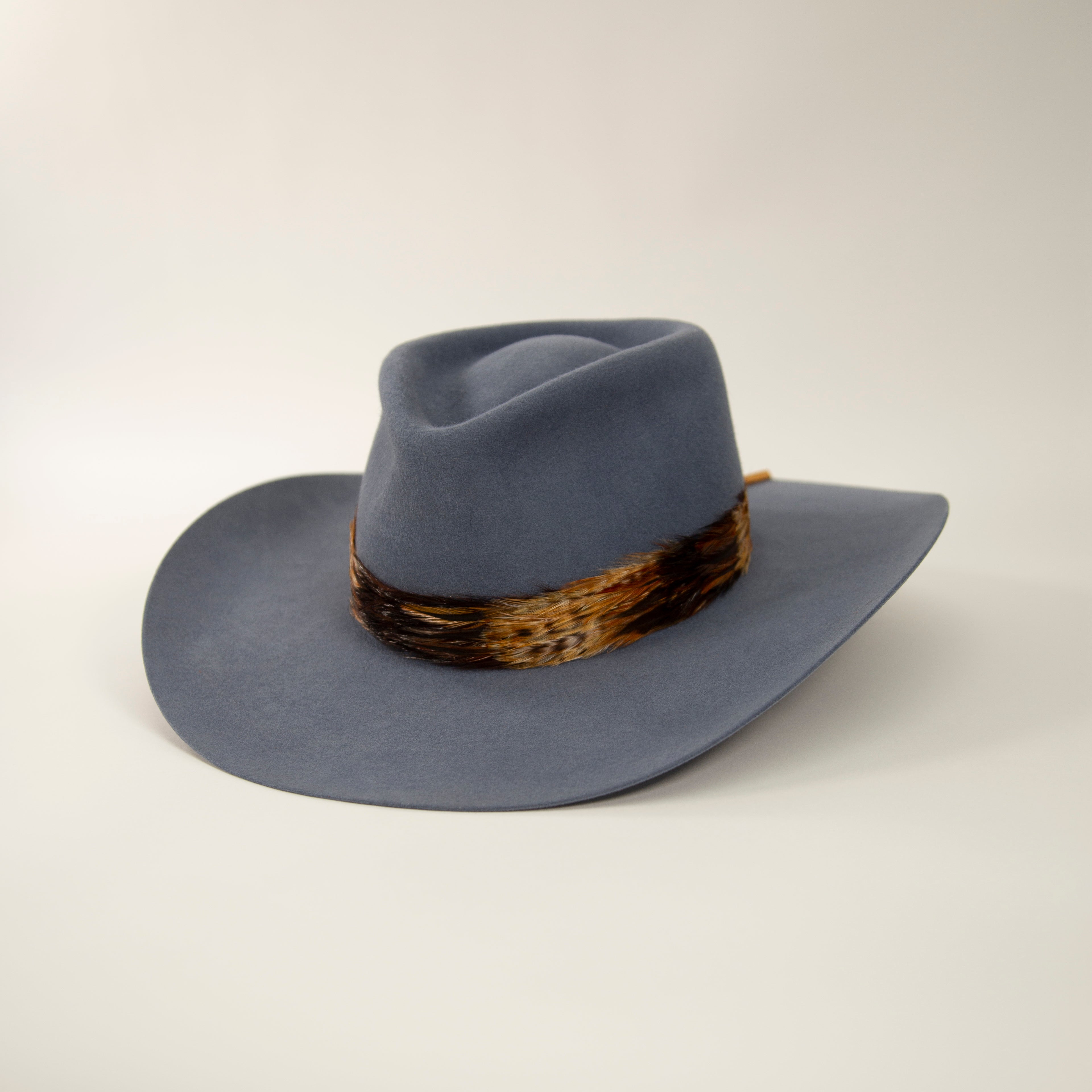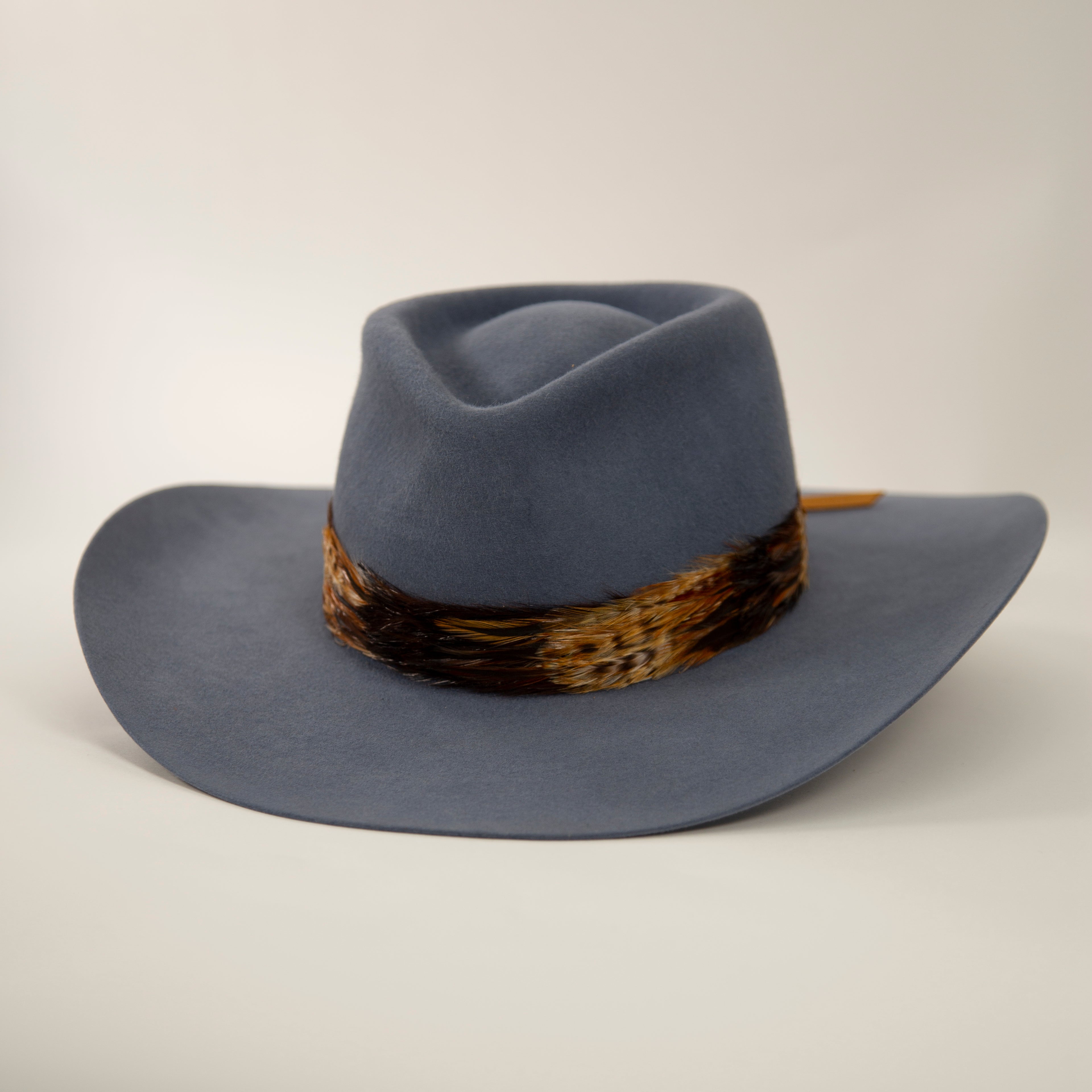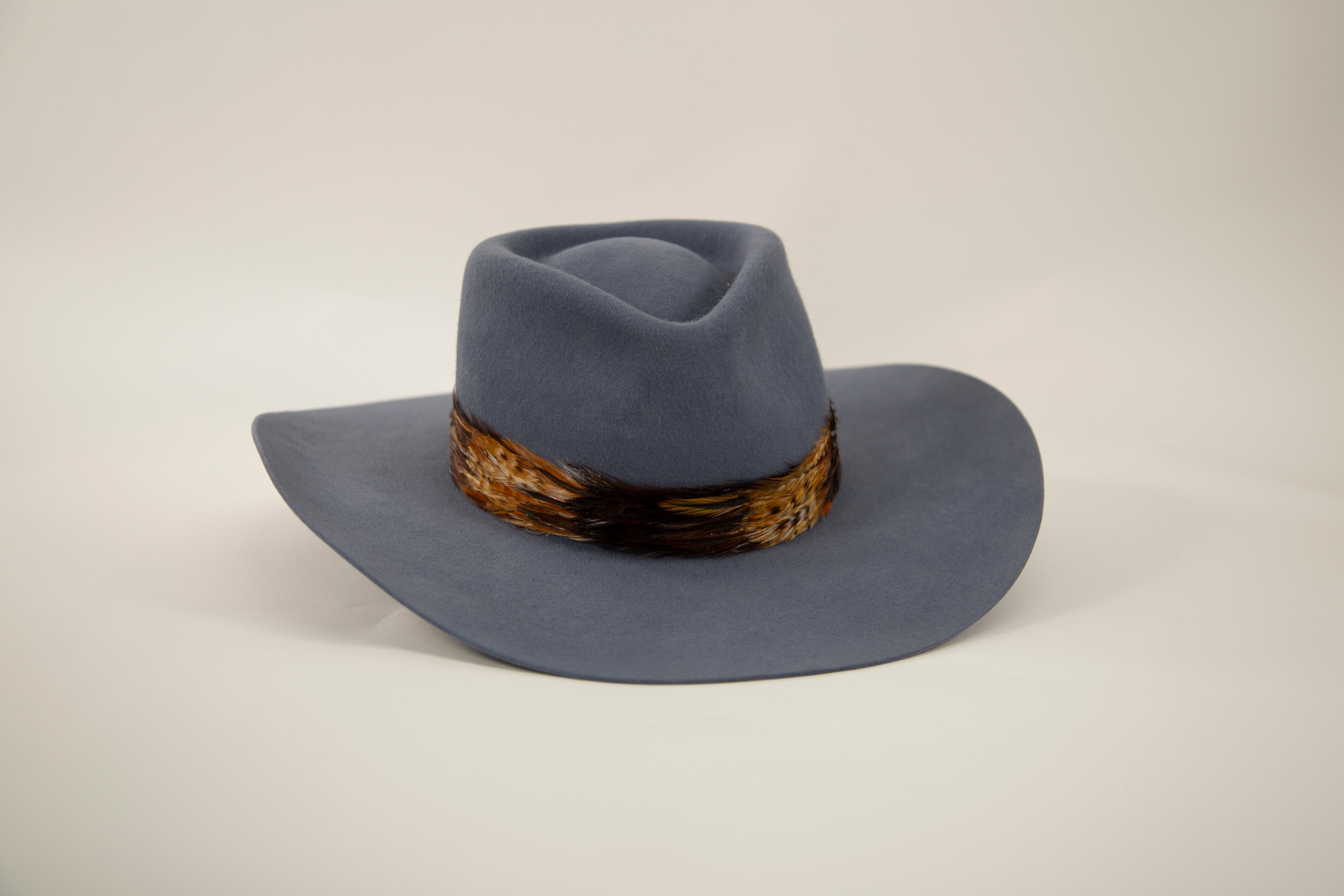 - Hat Band: Hand pieced together feather band with a light brown deerskin leather lace tie in the back.