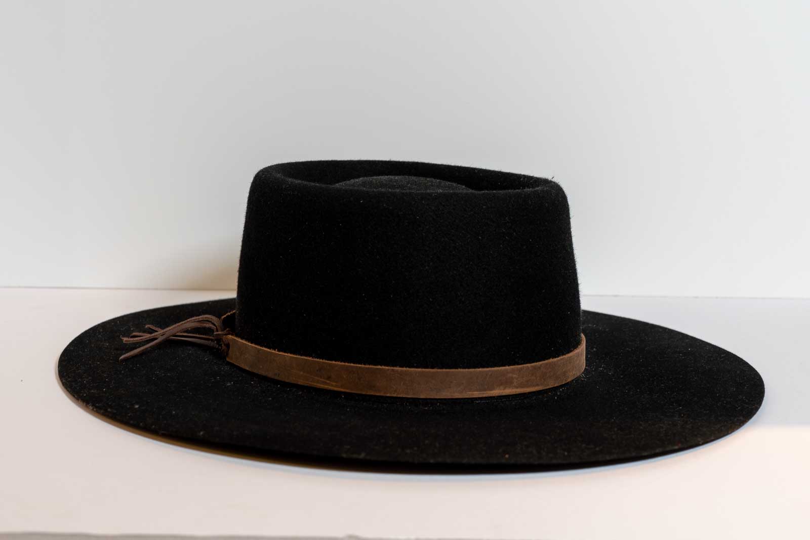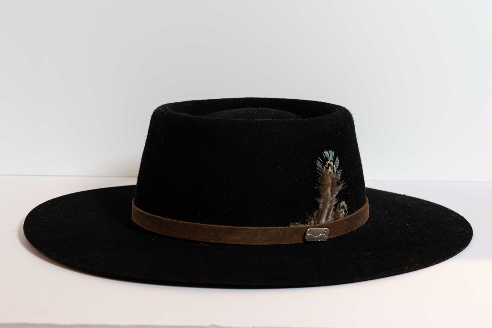 Our beloved telescope crown, made to the perfect crown height and touched with a hand dyed piece of leather and silver accents inspired by the Western slope of Colorado. Artist Angie Shierman handmakes each of these bands with passion and love in her studio outside of Paonia, CO. The Colorado inspired band is paired with light blue pheasant feather so add a pop to the mix.