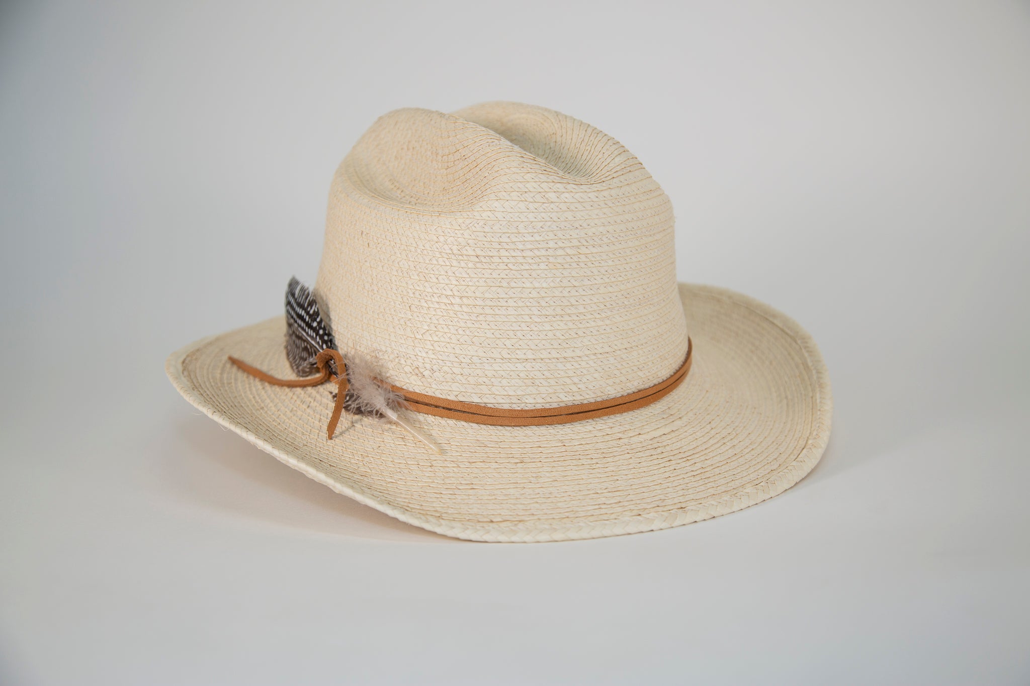 Double wrap of tanned elk hide leather lace with a Guinea Pheasant feather tied on the side